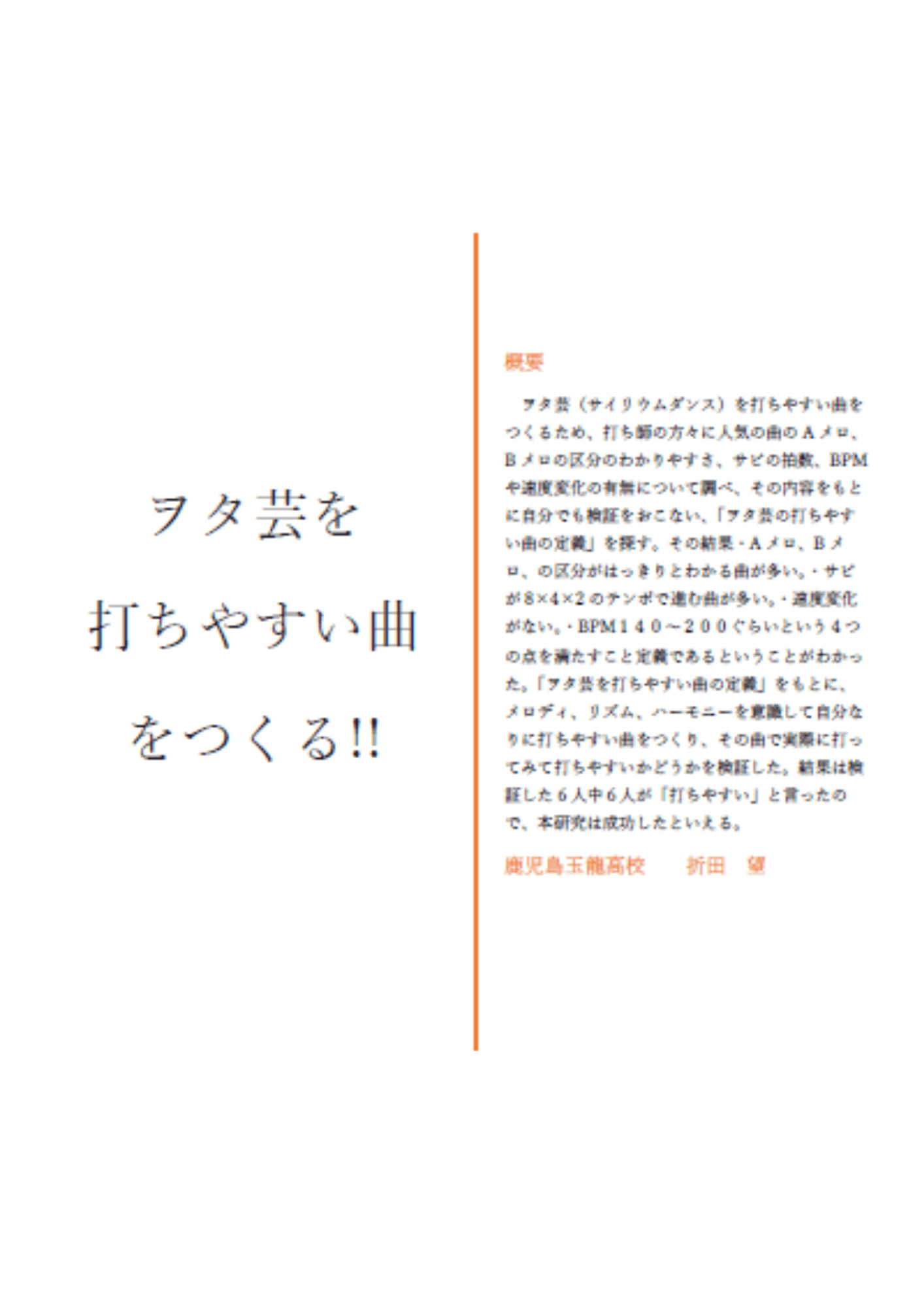 まず驚かされるのは、徹底した分析です。「ヲタ芸」を踊りやすい曲の特徴を探るため、なんと27曲もの楽曲を分析!周りの人や自身が実際に踊って検証まで行っています。さらに、曲の構成やテンポにも着目するなど、その視点の広さにも感服しました。