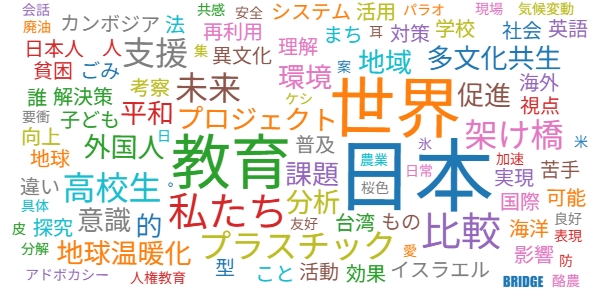 まずは簡単に「自由すぎる研究EXPO」に寄せられた「グローバル」の作品のタイトルに登場したキーワードを眺めてみよう。